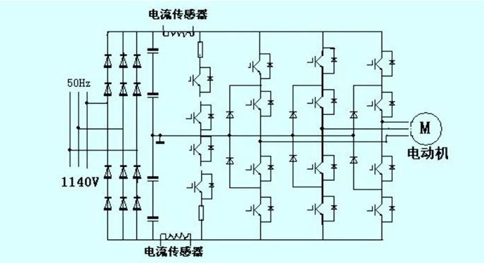 (3)更換保險絲后,機(jī)柜正常上電,工頻啟動并正常工作,工頻維修結(jié)束。然后維修變頻部分。主電路如圖1所示。
